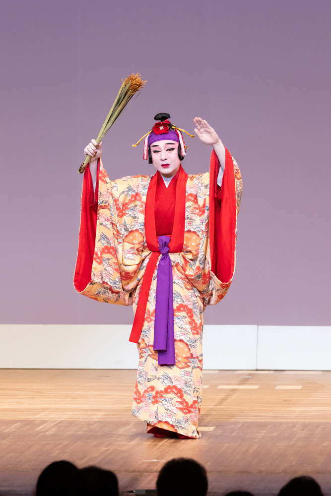 五穀豊穣を祈る女踊で幕が開きます。この踊りの小道具の稲穂は、まさしく世果報の象徴であり、稔り豊かな御代を願って踊ります。紅型衣裳の華やかさとともに、厳かな雰囲気を醸し出す古典女踊です。