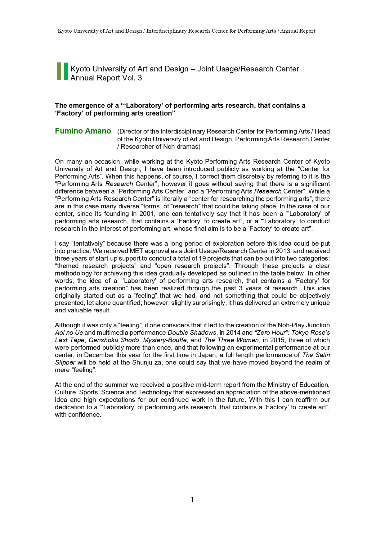 ◆舞台芸術と舞台芸術研究の融合、あるいは連携―「アニュアルレポート」の発行に寄せて―(天野文雄)