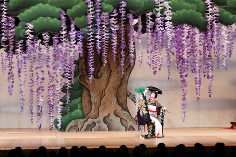 暗い舞台が一瞬でパッと明るくなると、黒い塗り笠をかぶり、藤の枝を持った藤娘が、大きな藤の花房の下に立っている。艶やかさに心を奪われる瞬間である。一体どこから現れたのか、そんなことはまるで気にならない。團子のすらりとした容姿、手足の動きから、娘の初々しさがたちのぼる。
