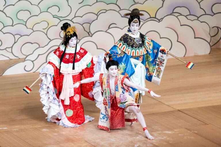 『流星』は、天上で七夕の逢瀬を楽しむ牽牛 (市川笑野) ・ 織女 (市川猿紫) のもとに、流星(團子)が飛んできて、雷の夫婦げんかの様子を “実況中継” するという清元の舞踊。「ご注進、ご注進」と声を掛け、花道からかけ出た流星 (團子) は、祖父の二世猿翁 (三世猿之助) が踊った折に、毛利臣男 (元・春秋座芸術監督) がデザインしたカラフルな雲柄の衣裳をまとっている。素肌に羽織る衣裳だけに、動きのごまかしがきかない。